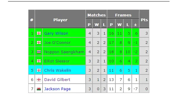 接下来,埃利奥特则取得1胜2战绩,总成绩排在第三。奥康纳取得1胜1负的战绩,总成绩排在第四,上述四人晋级到小组半决赛。新科苏格兰公开赛冠军韦克林则以3胜3负的战绩(比较小分)排在第五,无缘小组四强,但是能够滚动到下一一组继续参赛。