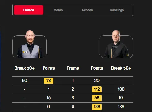 小组决赛,埃利奥特-莱瑟斯对阵加里-威尔逊。此役,威尔逊单杆50分开局,埃利奥特随后强势发力微配资,他轰出两杆破百(108分、138分)和一杆50+(57分),连扳三局之后,总比分3-1逆转夺得小组冠军,四局比分为:20-78 (50), 112-1 (108), 65-16 (57),祝贺他!